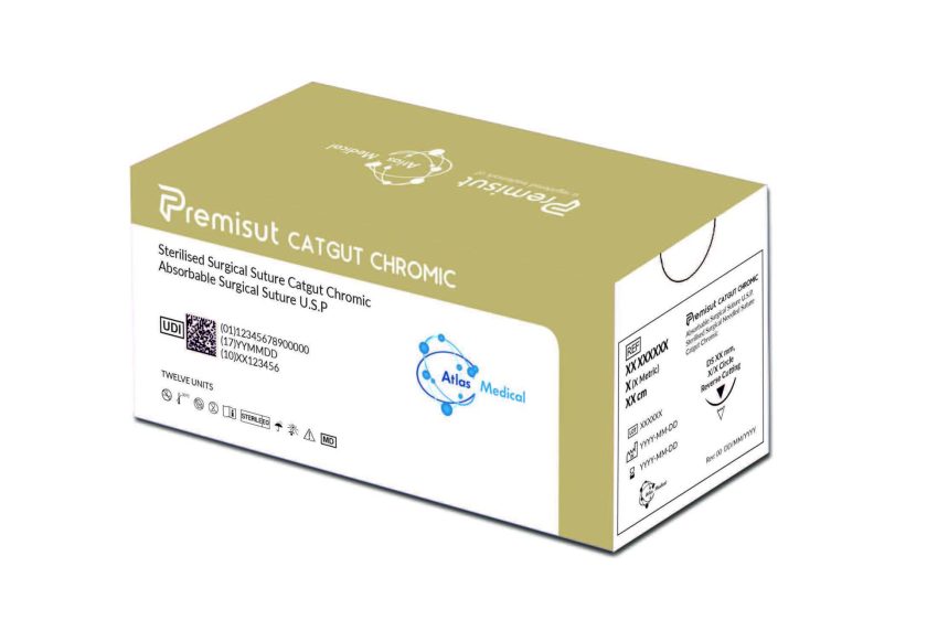 Premisut Catgut Chromic is a sterile absorbable surgical suture composed of purified connective tissue (collagen) derived from the sub-mucous layer of sheep (bovine) intestine. Pre...